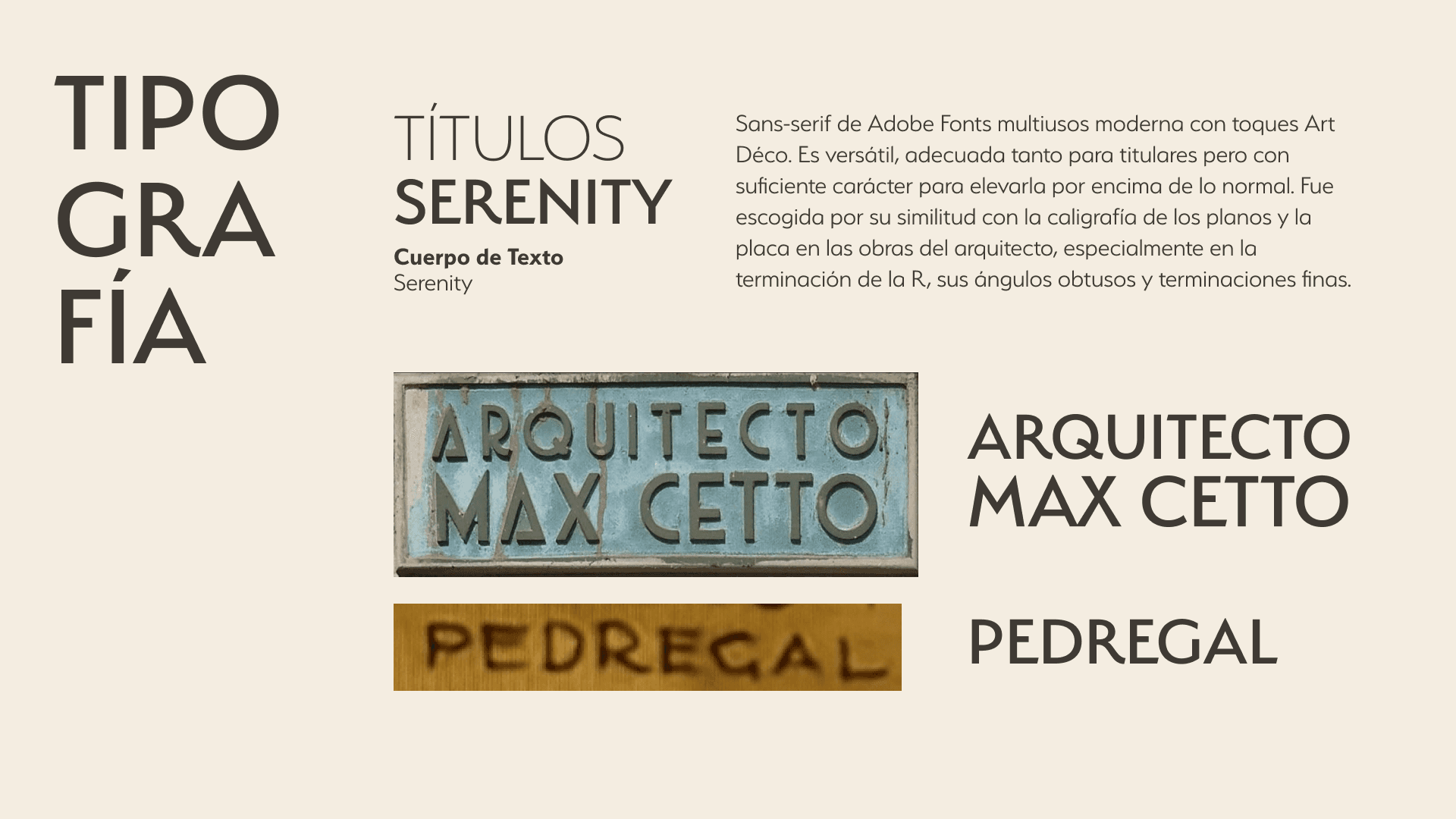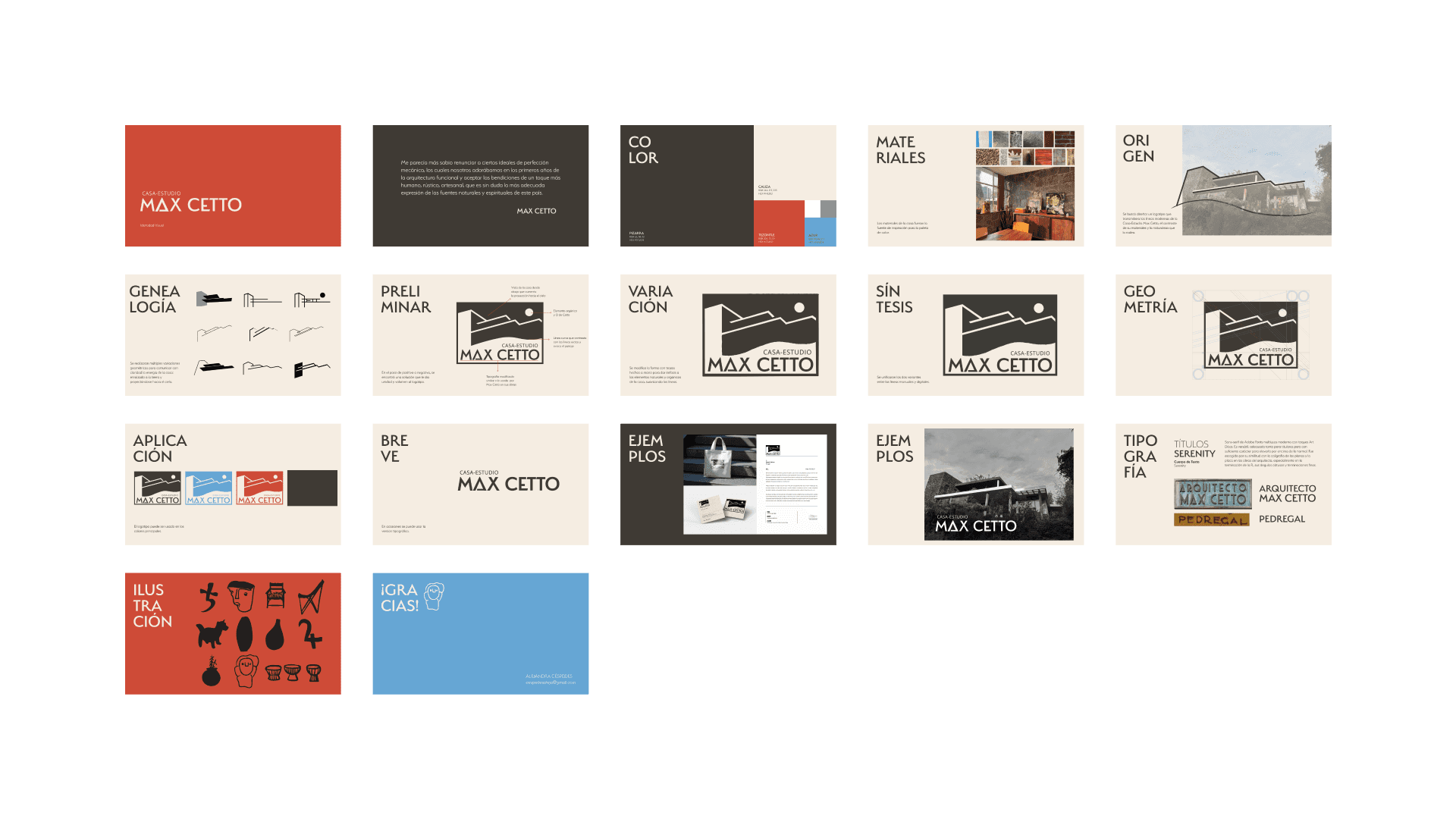 Branding project for Casa-Estudio Max Cetto that distills the modernist home's architectural DNA into a visual system: a logo refined through geometric iterations and softened with hand-drawn strokes to echo the organic elements of the site, supported by Art Déco typography referencing the architect's own lettering and a color palette extracted from the home's natural materials.